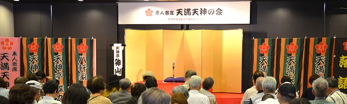 会場ホールの壁には「素人寄席・天満天神の会10年の足跡」のパネルが展示され、出演者の幟も飾られ華やかな雰囲気が出来上がりました。