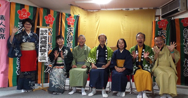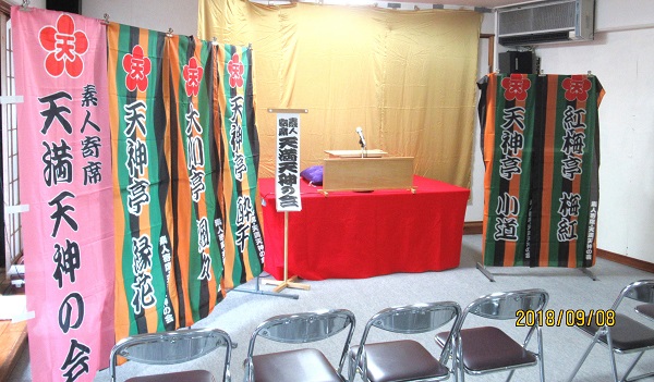 お茶子は「射心」アナウンスは「うつぼ」が務め、下座は三味線「真ん紀」、鳴り物「裕次郎」「岩塩」の天満天神社中による生演奏です。