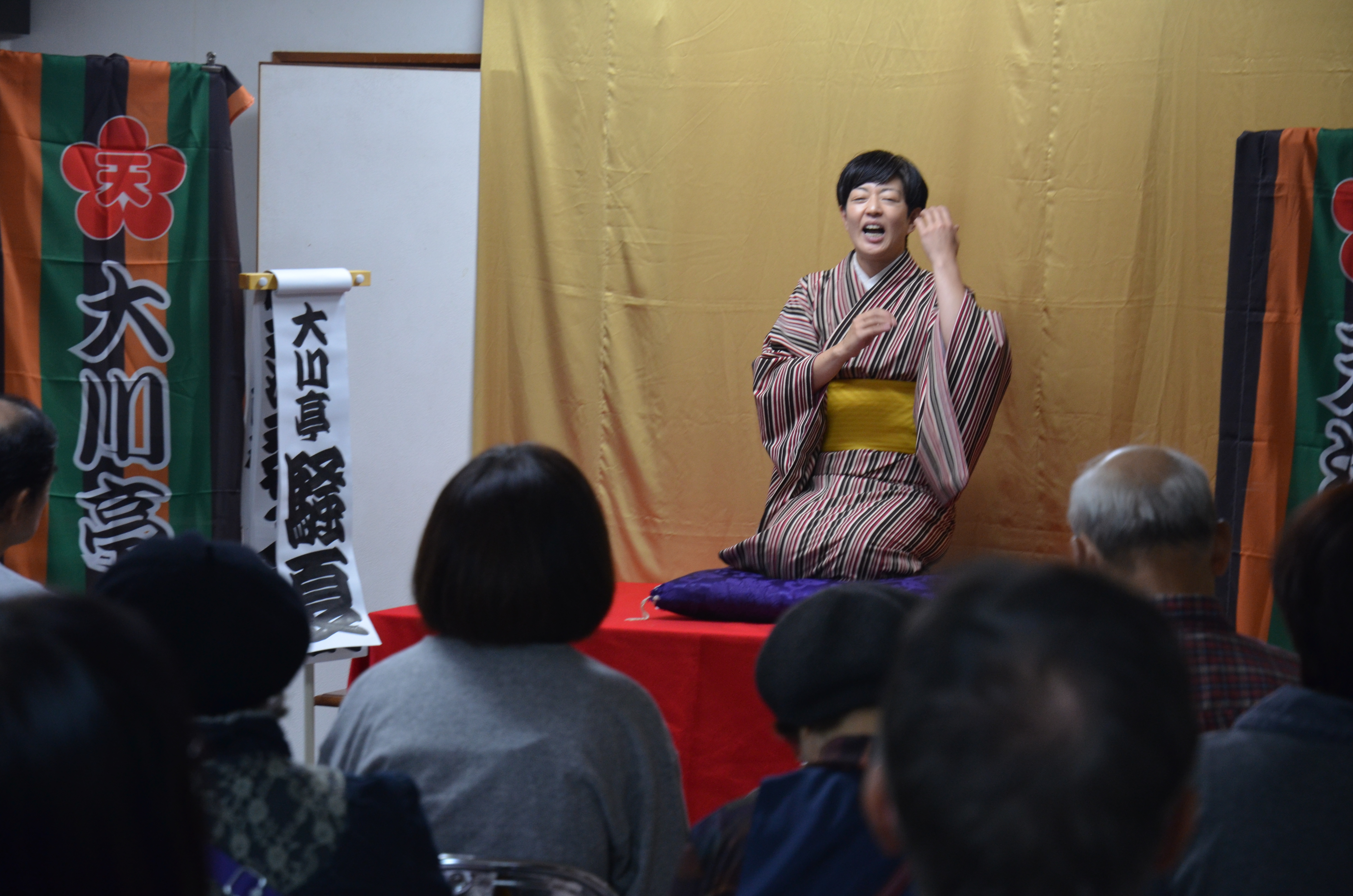 お寺の地の利も良く、お囃子(三味線と太鼓)生演奏で寄席小屋風情は充分。