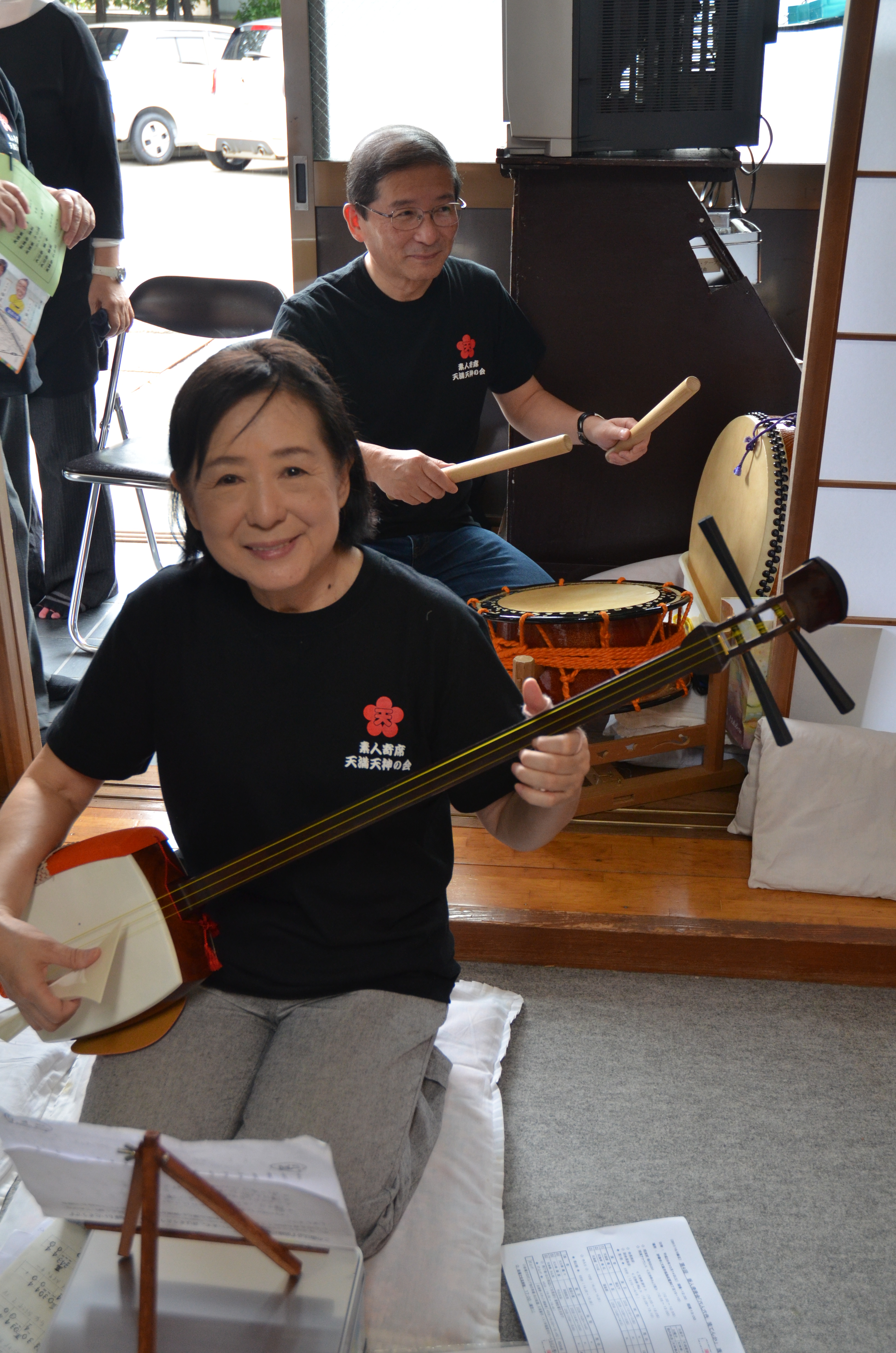 三味線は天神亭真ん紀、太鼓は八軒家裕次郎、お茶子は天満家射心。